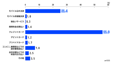 ・オンラインで、最も利用頻度が高い決済手段は「クレジットカード」(55.9%)で、次点の「モバイルQR決済」(25.4%)との差は30.5ポイント 、「コンビニ、郵便局などでの請求書現金払い」(7.0%)との差は48.9ポイントと、クレジットカードが他手段を大きく引き離して利用されていることがわかった。【図表5】
