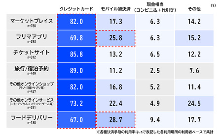 ・オンラインの利用場所別の決済手段について、「クレジットカード」の利用が主流である中、「フリマアプリ」(25.8%)、「フードデリバリー」(28.7%)など一部のサービスで「モバイルQR決済」が比較的利用率が高い結果となった。【図表7】
