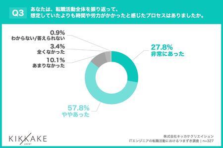 「Q3. あなたは、転職活動全体を振り返って、想定していたよりも時間や労力がかかったと感じたプロセスはありましたか。」(n=327)と質問したところ、「非常にあった」が27.8%、「ややあった」が57.8%という回答となりました。
