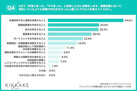 「Q4. Q3で「非常にあった」「ややあった」と回答した方にお聞きします。転職活動において、想定していたよりも時間や労力がかかったと感じたプロセスを教えてください。(上位3つまで回答可)」(n=280)と質問したところ、「企業研究や求人情報を収集すること」が49.6%、「職務経歴書を作成すること」が33.6%、「自己分析をすること」が33.2%という回答となりました。