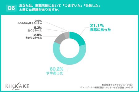 「Q6. あなたは、転職活動において「つまずいた」「失敗した」と感じた経験がありますか。」(n=327)と質問したところ、「非常にあった」が21.1%、「ややあった」が60.2%という回答となりました。