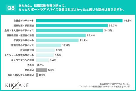 「Q8. あなたは、転職活動を振り返って、もっとサポートやアドバイスを受ければよかったと感じる部分はありますか。(上位3つまで回答可)」(n=327)と質問したところ、「自己分析のサポート」が44.3%、「面接対策・模擬面接」が36.7%、「企業・求人選びのアドバイス」が34.3%という回答となりました。