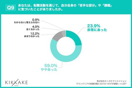 「Q9. あなたは、転職活動を通じて、自分自身の「苦手な部分」や「課題」に気づいたことがありましたか。」(n=327)と質問したところ、「非常にあった」が23.9%、「ややあった」が59.0%という回答となりました。