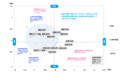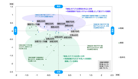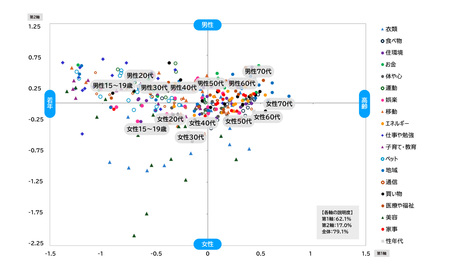 ・さらに、各カテゴリの分布を確認すると、「食べ物」「家事」など生命維持や生活基盤に近いカテゴリは50代以上を中心に配置され、「仕事や勉強」「娯楽」など余暇活動や自己実現に関わるカテゴリは10~40代に広く分布している。また、「美容」など外見に関わるカテゴリは女性に、「地域」など社会システムに関わるカテゴリは男性に分布。【図表7】【図表8】【図表9】