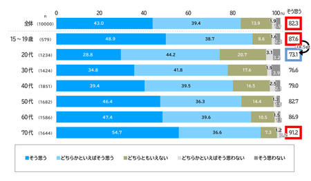 ・今後5年間で気候変動の影響が強まると考える人(「そう思う」「どちらかといえばそう思う」の合計)は、約8割(82.3%)。世代別では、70代(91.2%)、15~19歳(87.6%)の順に高い。一方で、20代(73.1%)は15~19歳(87.6%)と比べて14.5ポイント低く、世代別で最も低い。【図表1】