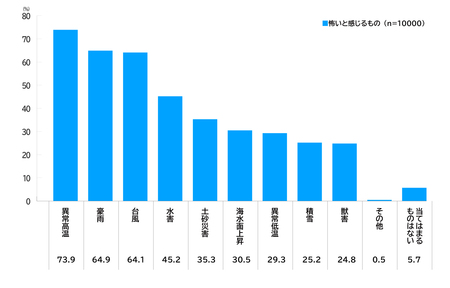 ・気候変動の影響で生じる災害のうち、怖いと感じるものは「異常高温」(73.9%)、「豪雨」(64.9%)、「台風」(64.1%)の順で多い。【図表2】