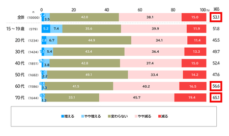・今後5年間、気候変動の影響で外出頻度が減ると考える人(「やや減る」「減る」の合計)は、半数を超える(53.1%)。世代別では、70代(65.1%)、60代(56.6%)の順で多く、特に、70代が全体よりも12.0ポイント高い。【図表3】