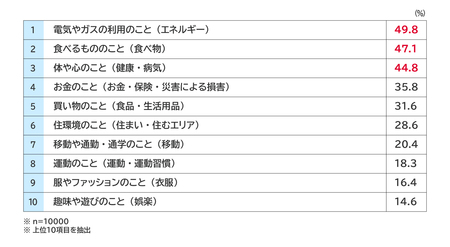 ・今後5年間で、気候変動の影響で変化が生じそうな生活カテゴリは、「電気やガスの利用のこと(エネルギー)」(49.8%)、「食べるもののこと(食べ物)」(47.1%)、「体や心のこと(健康・病気)」(44.8%)などが上位。【図表4】