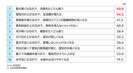 ・「電気やガスの利用のこと(エネルギー)」では、「夏が暑くなるので、冷房をたくさん使う」(60.8%)、「電気代が上がるので、生活費が増える」(54.3%)などの回答が多かった。【図表5】