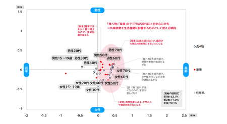 ・コレスポンデンス分析※1の結果、第一軸は年代差、第二軸は性別差を反映している構造となった。気候変動影響に対する関心カテゴリは、ライフステージおよび性別に沿っていると示唆される。【図表6】