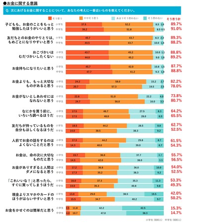 ・小中学生の間で比較的差が見られたのは、「お金がないとしあわせにはなれないと思う(小学生73.8%、中学生80.7%)」「人前でお金の話をするのはよくないことだと思う(小学生61.5%、中学生54.3%) 」でした。