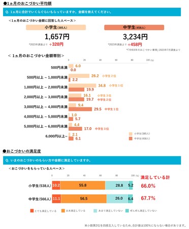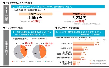 1.おこづかいの1ヵ月平均金額は小学生:1,657円、中学生:3,234円。 (2023年調査より小学生320円、中学生458円増額)