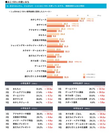 ・属性別にみると、小中学生全体と比較して小学生男子では「おもちゃ」が31.6%(+15.5pt)、小学生女子では「アクセサリーや雑貨」が38.4%(+16.5pt)、中学生男子「ゲームソフト」が26.7%(+12.3pt)、中学生女子「外でお茶・ごはん」が46.4%(+18.4pt)と差がみられました。