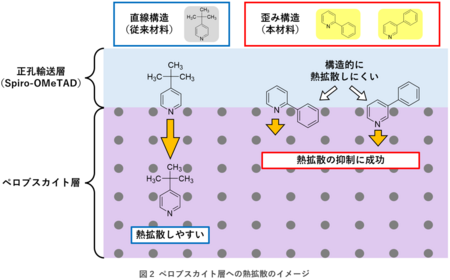 従来用いていた4-tert-ブチルピリジンは、窒素(N)と炭素から構成されるピリジン環に炭素4個からなるtert-ブチル基(置換基)を持ち、窒素(N)の位置に対して、置換基が180度反対側に接続した分子構造が特徴です(図1左)。ペロブスカイト層においては、分子は窒素(N)の方向に熱拡散すると考えられます。熱拡散する方向に対して、分子構造が直線的な構造のため、ペロブスカイト層に容易に熱拡散することが判明しました(図2左)。