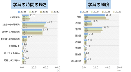 家庭学習の時間の長さについて聞きました。最も多かったのは、「15分~30分未満」で40.5%でした。次に「30分~1時間未満」が33.5%と続きます。家庭学習の頻度については「毎日」が35.3%と最も多く、「週5日」が31.5%と続きます。「毎日」は減少傾向にあることがわかりました。
