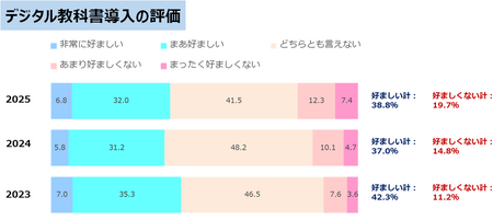 デジタル教科書の評価について聞きました。「非常に好ましい」は6.8%、「まあ好ましい」が32.0%と、合わせて38.8%の保護者が「好ましい」と評価している結果となりました。一方、「まったく好ましくない」は7.4%、「あまり好ましくない」が12.3%と、合わせて19.7%の保護者が「好ましくない」と評価しており、中でも「まったく好ましくない」とする保護者は、2023年の3.6%に比べ、2025年は7.4%と約2倍となっています。