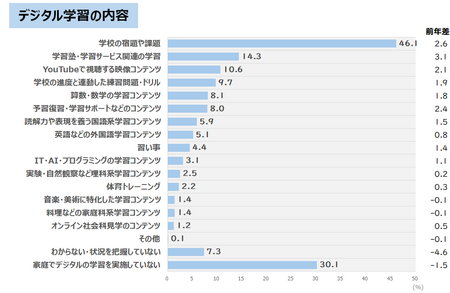 デジタル学習※の内容(複数回答可)について聞いたところ、最も多かったのは、「学校の宿題や課題」で46.1%でした。また「家庭でデジタルの学習を実施していない」と回答した保護者は30.1%という結果となりました。※デジタル学習とは、デジタル端末を通じて行う学習の全てを指します。