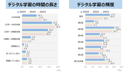 デジタル学習の時間の長さについて聞いたところ、「30分~1時間未満」「1時間~2時間未満」「2時間以上」が増加を続けており、「15分未満」「15分~30分未満」がともに減少を続けていることがわかりました。デジタル学習の頻度については「週5日」が20.1%と最も多く、「毎日」が17.0%と続きます。