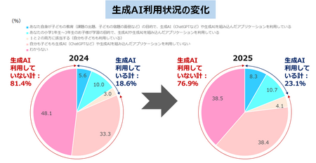 家庭学習における生成AIの利用状況を聞いたところ、「保護者自身が子どもの教育の目的で利用している」は8.3%、「小学1年生~3年生の子どもが学習の目的で利用している」が10.7%、「保護者と子どもの両方が利用している」が4.1%と、合わせて23.1%となり、昨年より4.5ポイント増加する結果となりました。