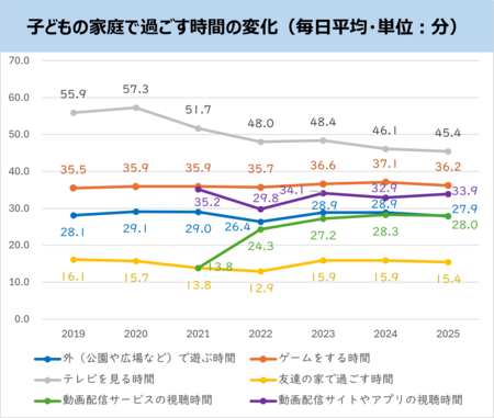 子どもの家庭での過ごし方について聞きました。最も多かったのは、「テレビを見る時間」で1日平均45.4分でした。次に「ゲームをする時間」が1日平均36.2分、「動画配信サイトやアプリ(YouTube、TikTok、ニコニコ動画など)の視聴時間」が1日平均33.9分と続きます。