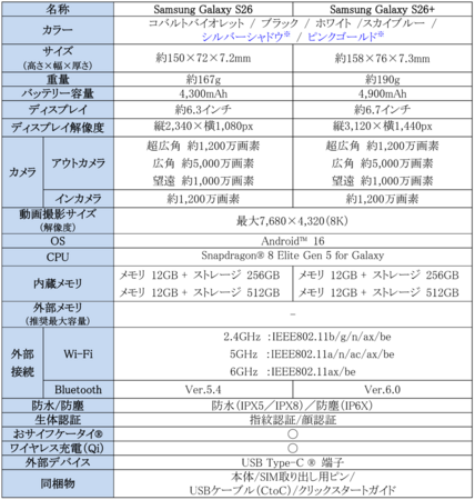 <主な仕様:「Samsung Galaxy S26」、「Samsung Galaxy S26+」>