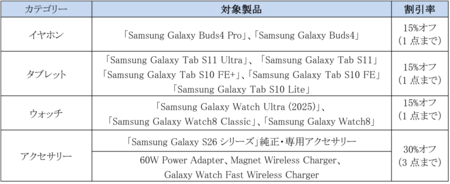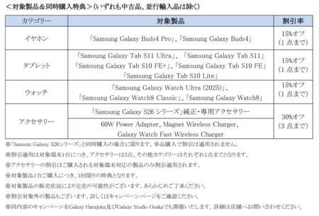 対象期間中にSamsungオンラインショップ、Galaxy Harajuku、Galaxy Studio Osakaで「Samsung Galaxy S26」「Samsung Galaxy S26+」「Samsung Galaxy S26 Ultra」(SIMフリーモデル)と同時購入すると対象製品が最大30%オフになるキャンペーンを実施いたします。