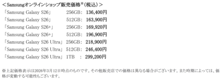 サムスン電子ジャパン株式会社(以下、サムスン)は、パワフルなハードウェアと業界をリードするカメラ性能、進化した直感的なGalaxy AI※が日常をかつてないほど快適で簡単にしてくれる先回りするAIフォン「Samsung Galaxy S26」「Samsung Galaxy S26+」「Samsung Galaxy S26 Ultra」 (SIMフリーモデル)(以下、「Samsung Galaxy S26シリーズ」)を、本日2026年3月12日(木)より、Samsungオンラインショップ(https://www.samsung.com/jp/offer/)、「Galaxy Harajuku」(東京・原宿)、「Galaxy Studio Osaka」(大阪・なんば)にて販売を開始いたします。
