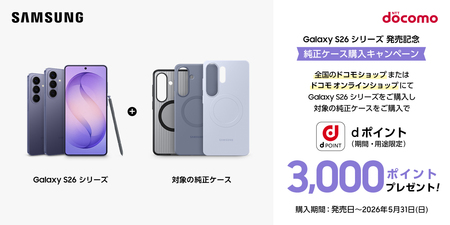 対象期間中に全国のドコモショップ、ドコモオンラインショップ、ahamoサイトにて、「Samsung Galaxy S26シリーズ」と対象の純正アクセサリーを両方ともご購入いただいたお客様に、dポイント(期間・用途限定)をプレゼントいたします。