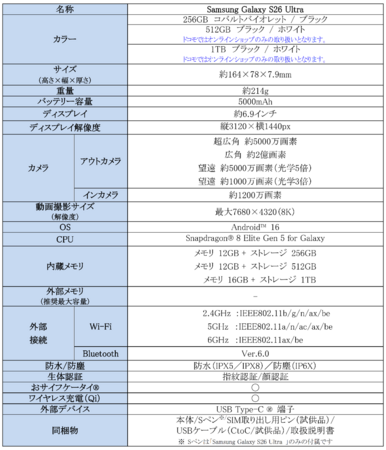 <主な仕様:「Samsung Galaxy S26 Ultra」>