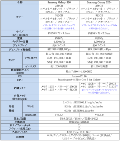 <主な仕様:「Samsung Galaxy S26」、「Samsung Galaxy S26+」>