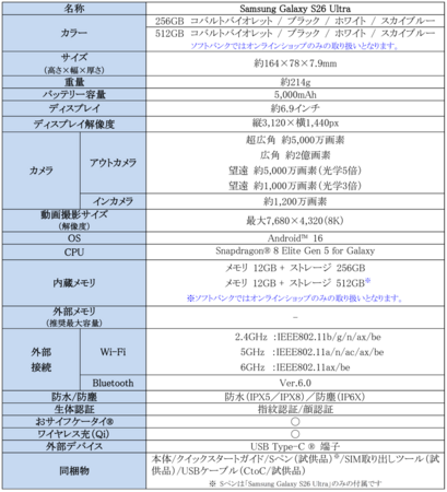 <主な仕様:「Samsung Galaxy S26 Ultra」>