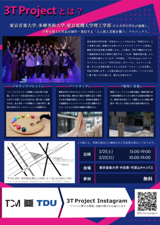 *3Tプロジェクトとは… 多摩美術大学、東京音楽大学、東京電機大学理工学部の3大学の学生が連携し、 分野を越えた作品を制作・発信する「人と街と芸術を繋ぐ」プロジェクトです。