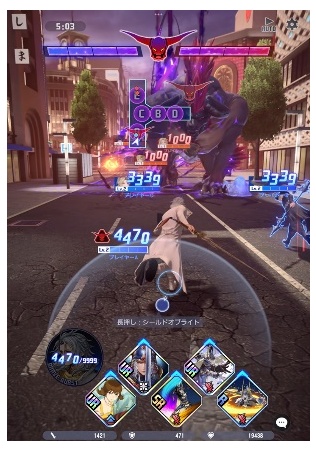 3 対 3 の 2 チームと魔物が入り乱れる中、相手チームより早く巨大ボスの討伐を目指す「ボス討伐型チームバトル」です。片手でも遊べるシンプルな操作で爽快アクションが展開。メインストーリーでは、現代・東京に召喚された戦士たちの物語がフルボイスで楽しめます。