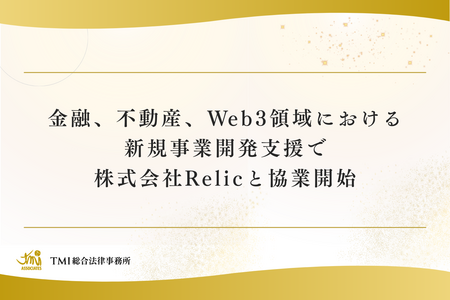 TMI総合法律事務所(所在地:東京都港区、代表:田中 克郎、以下TMI)は、事業共創カンパニーである株式会社Relic(本社:東京都渋谷区、代表取締役CEO:北嶋 貴朗、以下Relic)と金融、不動産、Web3(以下、連携業界)といった高度な専門知識を要する領域における新規事業開発支援を強化するため、法務面での協業体制を構築しました。本提携により、連携業界事業者の新規事業開発を支援する体制を強化し、連携業界のイノベーション創出支援を強固に推進します。なお本提携は、Relicが推進する連携業界での事業開発支援体制を強化するものであり、TMIはその過程で必要となる法務面の検討・確認を専門的に支援します。※1