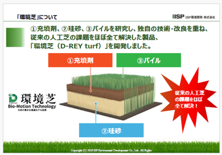 1.「アスリートを怪我から守る」・「充填剤にゴムチップを一切使わない」・「人に安全・安心な人工芝」をコンセプトに、世界各国において各種世界大会で使用されている競技用人工芝をベースに、独自の技術・改良を重ね開発した人工芝が当社の「環境芝」です。