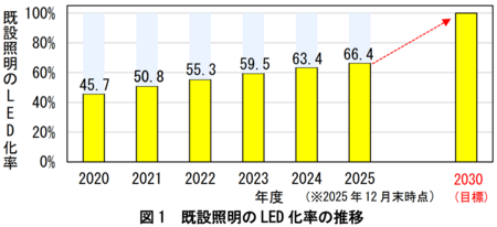 一般社団法人日本照明工業会(JLMA)の統計によると、「既設照明のLED化率」(※3)は2025年12月末時点で66.4%となり、LED照明に変更する動きが進んでいます。