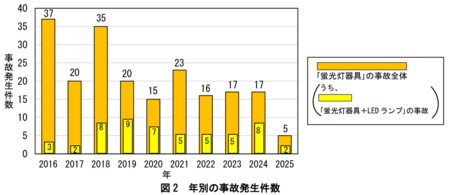 このうち、照明のLED化の際に「ランプだけをLEDランプに交換する方法」を選択したことに起因する「蛍光灯器具+LEDランプ」の事故も各年で確認されています。古い蛍光灯器具を継続使用したり、既存の蛍光灯器具のままランプのみをLEDランプに交換したりすると、器具内部の部品の劣化は続くため、今後も「劣化した蛍光灯器具による事故」が続くおそれがあります。