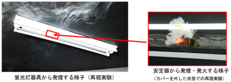 蛍光灯器具から発煙する様子(カバーを外した状態での再現実験)