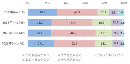 Webサービスやアプリを利用する際に、自分や家族の個人情報を提供することに抵抗を感じる人は2025年調査と同水準の約70%でした。一方、全く抵抗がないと回答した人は、全体で約3%にとどまりました。