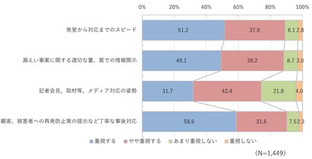 信頼回復のために特に重視されるのは、「顧客・被害者への丁寧な事後対応(再発防止策の提示など)」58.6%、「発覚から対応までのスピード」51.2%でした。