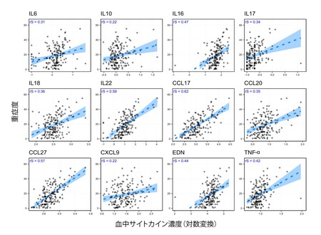 アトピー性皮膚炎患者170名の、血中サイトカイン濃度(log10変換)と重症度(EASI)の関連。CCL17、IL-22、IL-18を含む複数のサイトカインが重症度と関連を示し、血液検査による病勢評価の可能性が示された。※Spearmanの順位相関係数(rS)を図中に示す。