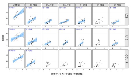 本研究では、慶應義塾大学医学部皮膚科学教室、理化学研究所生命医科学研究センター(IMS)、シスメックス株式会社の共同研究グループが、アトピー性皮膚炎患者170名の血中サイトカイン(注3)を横断的に解析し、そのうちデュピルマブ治療を受けた24名を6か月間追跡する縦断研究を行いました。従来から用いられてきたCCL17に加え、IL-22およびIL-18を含む複数の炎症関連サイトカインと皮膚症状の重症度(Eczema Area and Severity Index : EASI)との関係を検討しました。