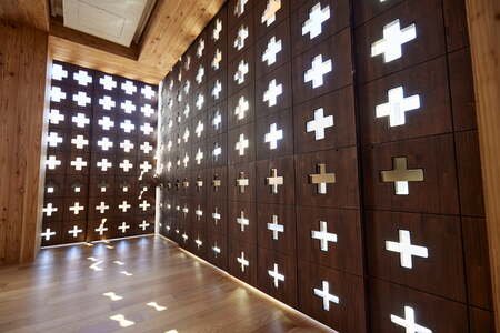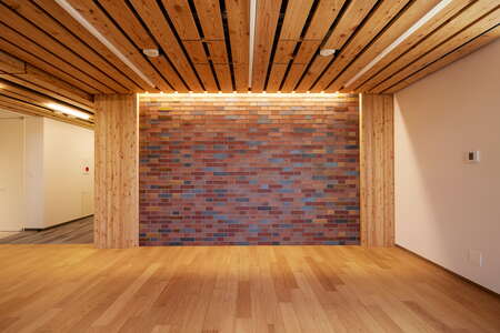 06_木造の質感と本学伝統のレンガ意匠を調和させた内装