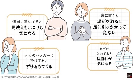 その気づきをきっかけに、社内の調査・研究機関である「赤ちゃんのいる暮らし研究所」と連携し、子育て中のママ・パパへのインタビュー調査(※)を実施。すると、抱っこひもの収納に悩んでいるという声が多数寄せられました。(※)2025年8月アカチャンホンポ店頭インタビュー結果(n=43)