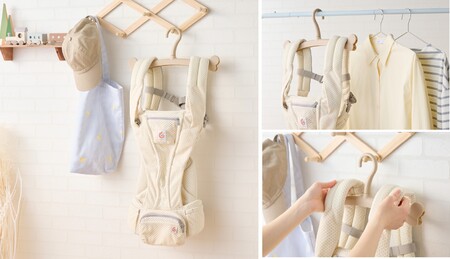 本商品は、おでかけに欠かせない抱っこひもを型崩れせずにキレイに収納できる抱っこひも専用のハンガーです。