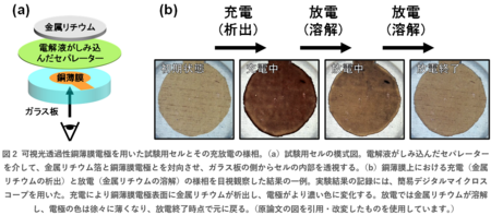 この銅薄膜電極と金属リチウム箔とを組み合わせた試験用セルを試作しました。作製した可視光透過性銅薄膜はガラス板で支持されているため、機械強度に優れています。そのため、加圧した試験用セルを組み立てることができました。このセルを動作させたときに観察された、銅薄膜上における金属リチウムの析出と溶解の様相を図2に示します。