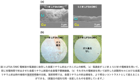図3bには1.1 Mと5.5 M電解液で試作した試験用セルにおける、リチウム析出時の観察結果の一例を示します。1.1 M電解液では電極内部でのガス発生が確認できました。ガス発生部分では、電極と電解液との接触が妨害されるため、金属リチウムの析出が起こりません。結果的に充電後も元の銅薄膜の色のままになります。発生したガスは、電極表面を覆い、金属リチウムの緻密な析出を妨害します。そのため、ガス発生の顕著な電解液では、多孔質な金属リチウム析出形態になると考えられます。一方で5.5 M電解液では、ガスの発生は確認されませんでした。この電解液では金属リチウム析出がガスに妨害されないため、その析出形態はより緻密なものになったと考えられます。