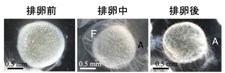 図2. 排卵により卵が膜(F)から離れると渦巻き状に密着していた糸(A)がほどける。