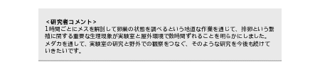各環境において4日間で144匹を調べたところ、メスの半数が排卵を完了する時刻は、野外に近い環境では日の出の約4.2時間前、実験室環境では照明点灯の約0.7時間前であった。つまり、野外に近い環境では、実験室より約3.5時間早く排卵していたことが判明した。