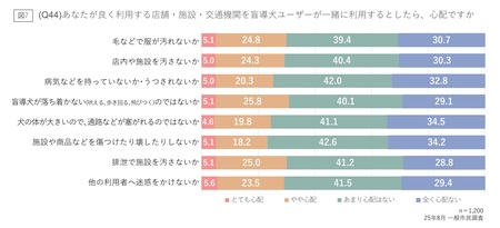 『あなたがよく利用する店舗・施設・交通機関を盲導犬ユーザーが一緒に利用するとしたら、心配ですか(Q44)』という問いでは、犬の衛生面や行動面など9つの観点で確認したところ、全体の約7割の人が「あまり心配ではない」「全く心配ではない」と回答しました(図7)。